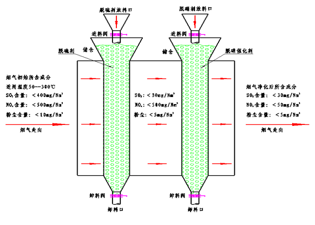 主要工藝是煙氣首先通過反應器中脫硫劑顆粒層,經催化氧化將SO2轉化成SO3,并被反應固化成硫酸鈣固體(CaSO4);脫硫后的煙氣再經過脫硝劑顆粒層,將NO轉化成NO2,同時與煙氣中的CO還原成N2和CO2排放。在反應器中,由于床料的存在,使脫硫劑和脫硝劑能以較大表面積散布,先脫去煙氣中的SO2,再脫除煙氣中的NOX, 并對煙氣中的粉塵進行攔截吸附,凈化煙氣。反應器內生成的副產物,隨脫硫脫硝效率降低,定期置換,回收做建筑材料。